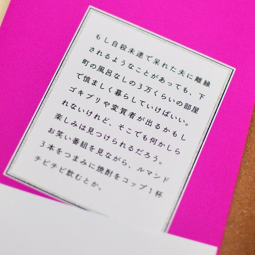 もし自殺未遂で呆れた夫に離縁されるようなことがあっても、下町の風呂なしの3万くらいの部屋で慎ましく暮らしていけばいい。ゴキブリや変質者が出るかもしれないけれど、そこでも何かしら楽しみは見つけられるだろう。お笑い番組を見ながら、ルマンド3本をつまみに焼酎をコップ1杯チビチビ飲むとか。